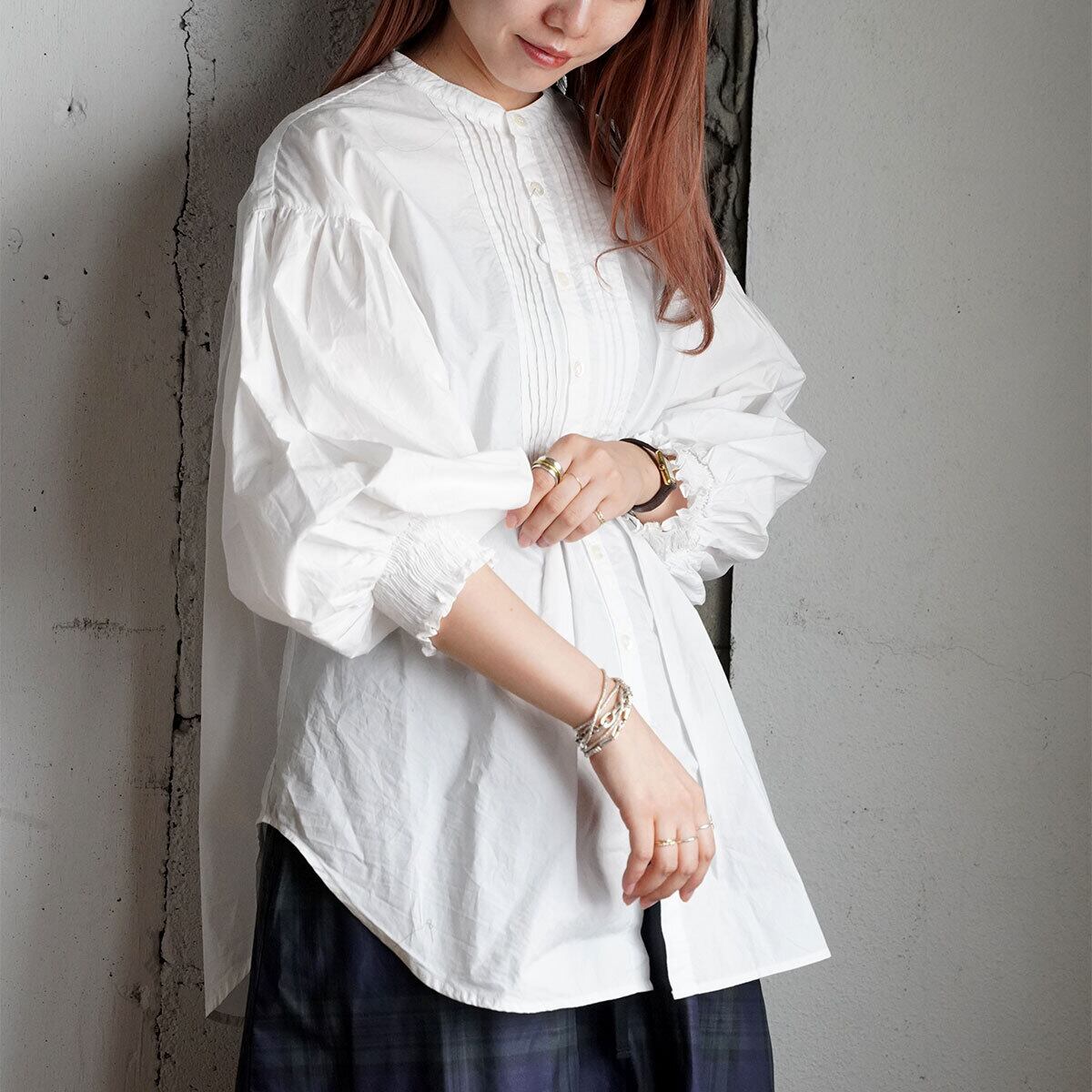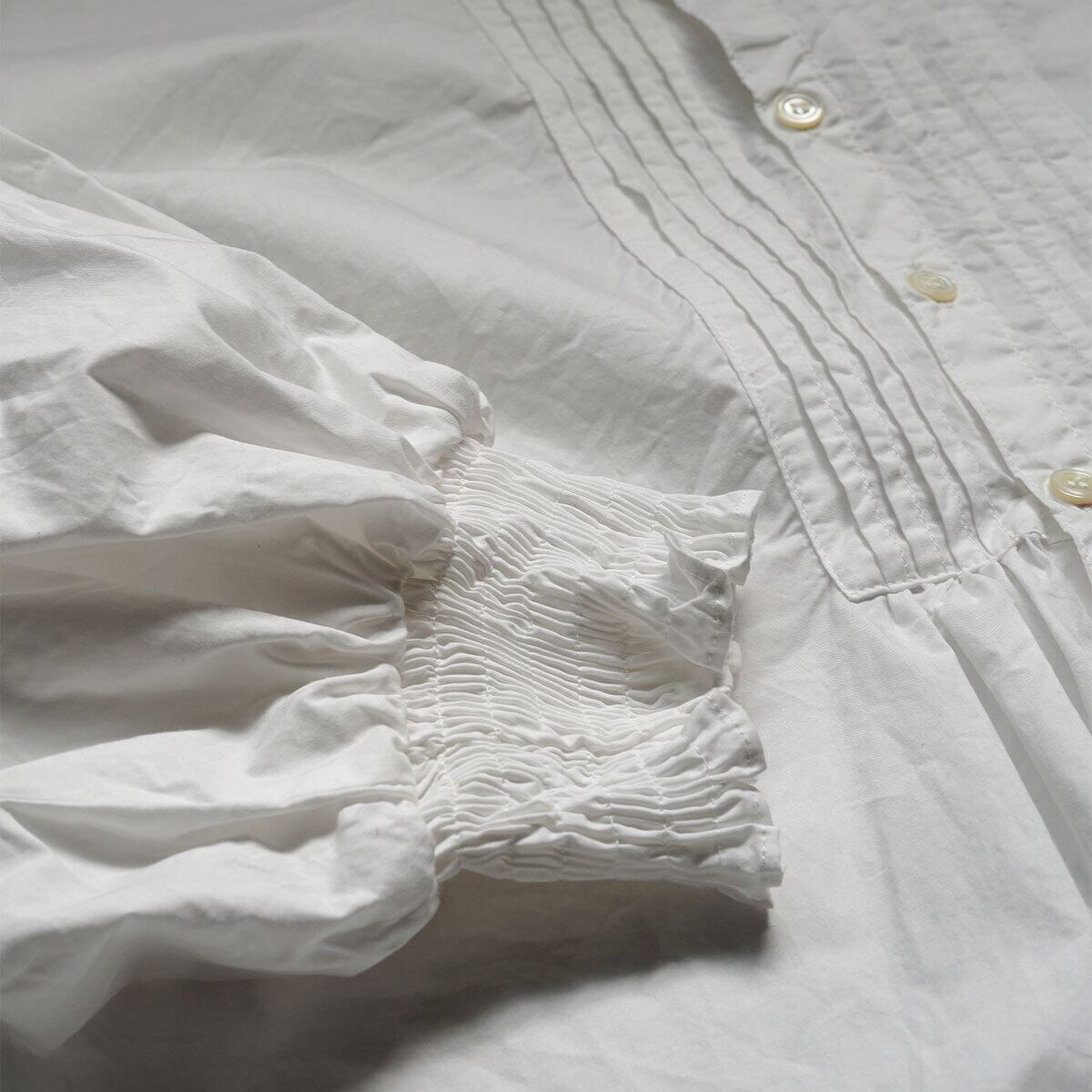 胸元に整然と並ぶピンタック、ふんわりと膨らむ袖口。
