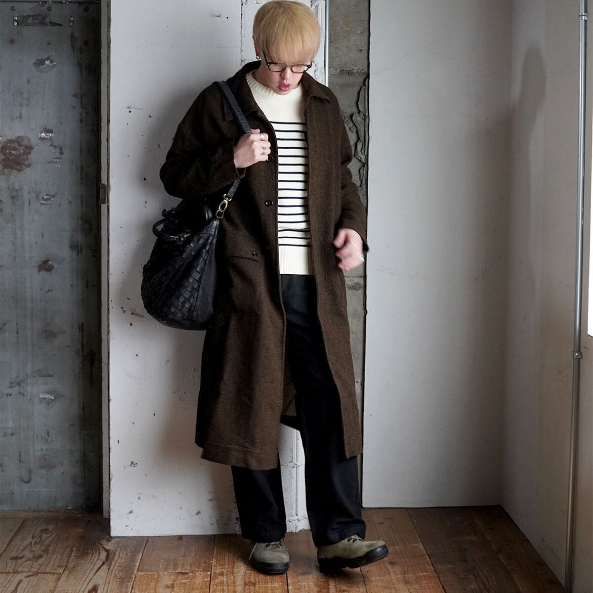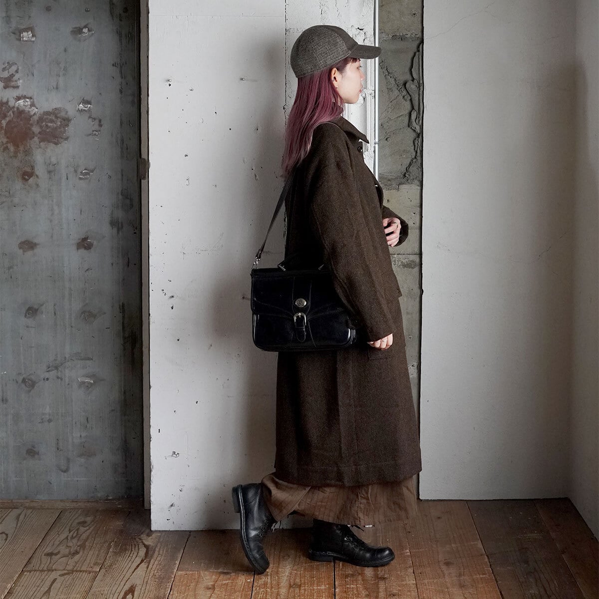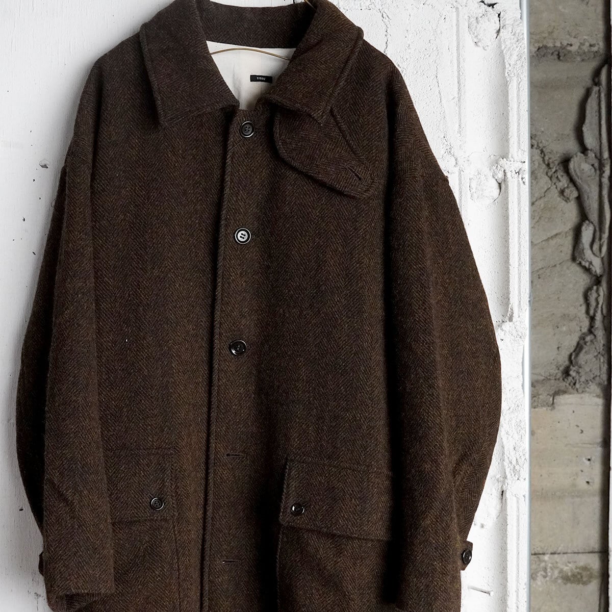 秋冬らしい生地ブラウンカラーのウールヘリンボーン生地が目を惹く
