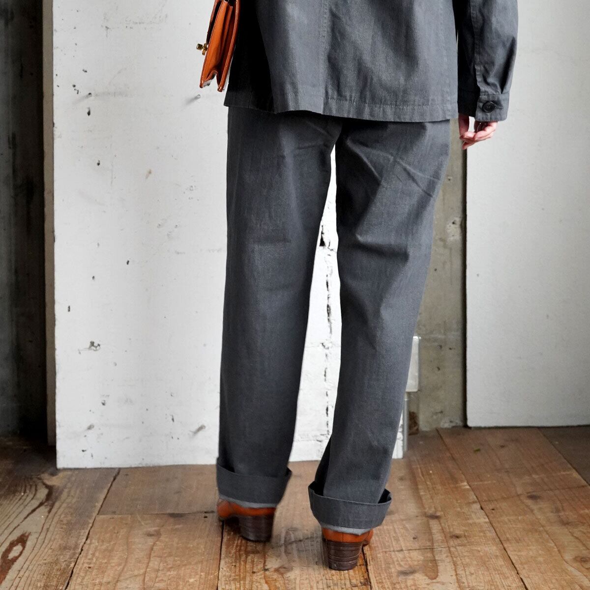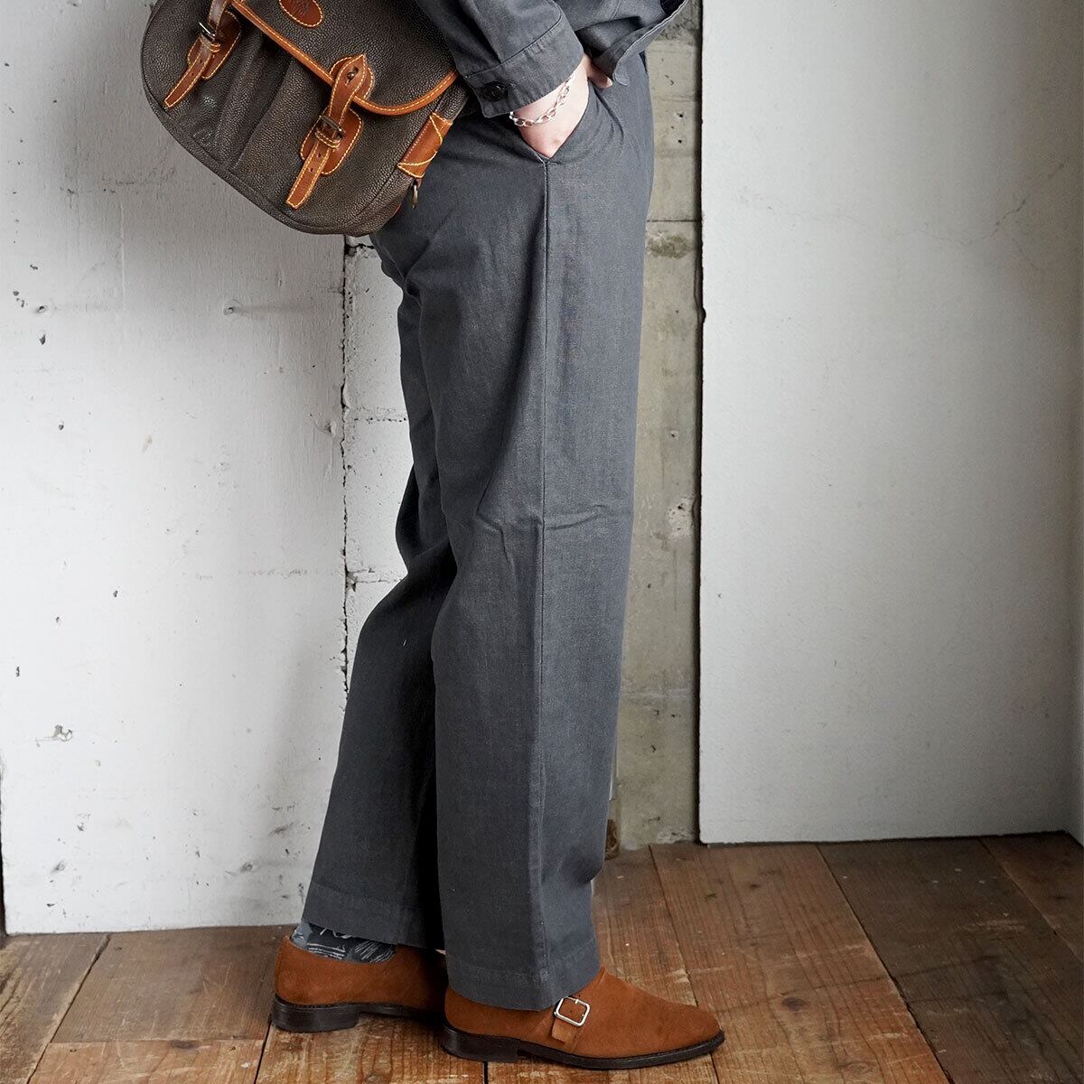 生地は、一目するとデニムのような無骨さを持った硫化染めのチノクロス。