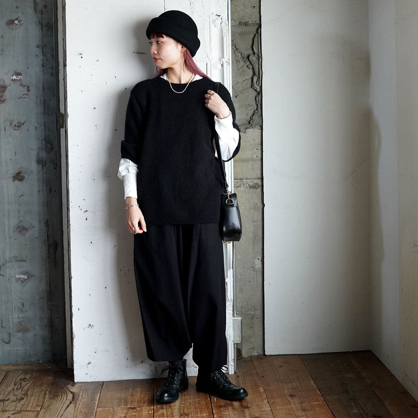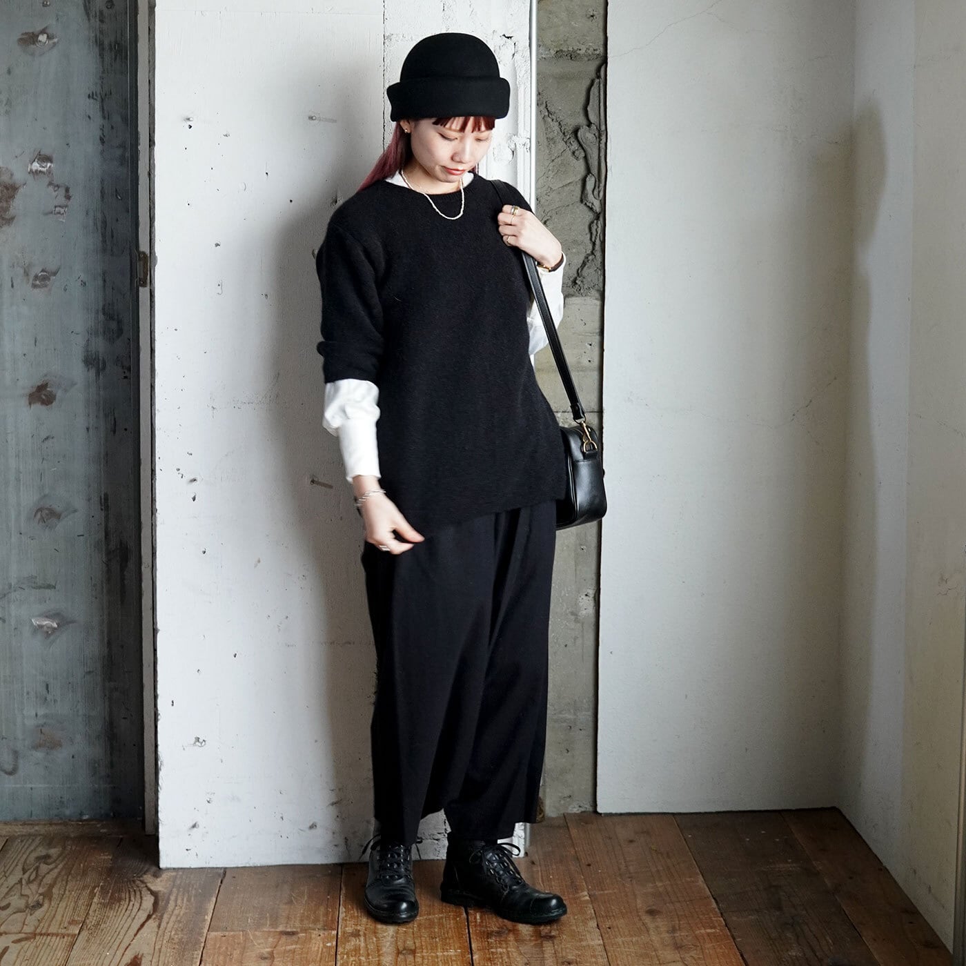 インナーに長袖のカットソーや薄手のウール素材のアイテム、