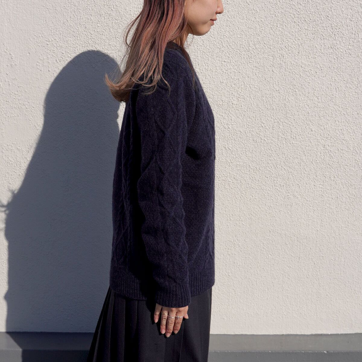 肩から袖へと続く大きなダイヤ柄と、細やかな編み地のコントラスト。