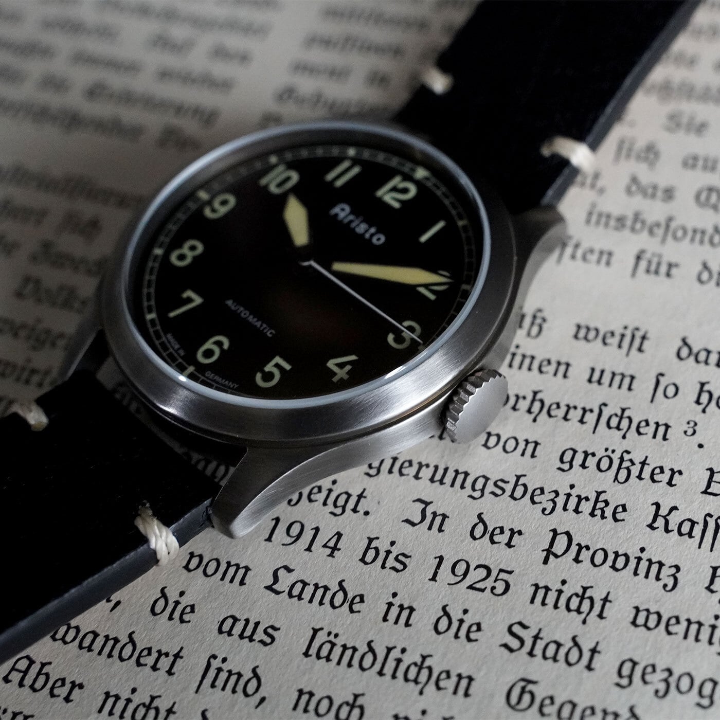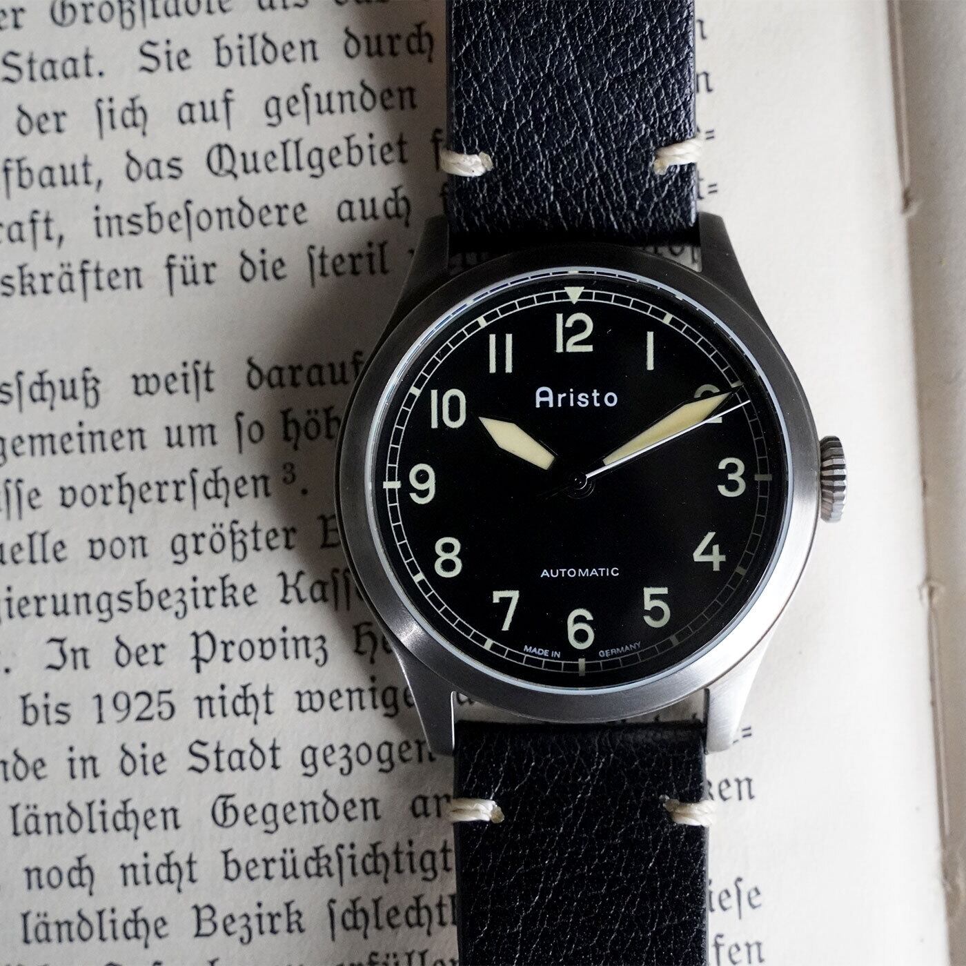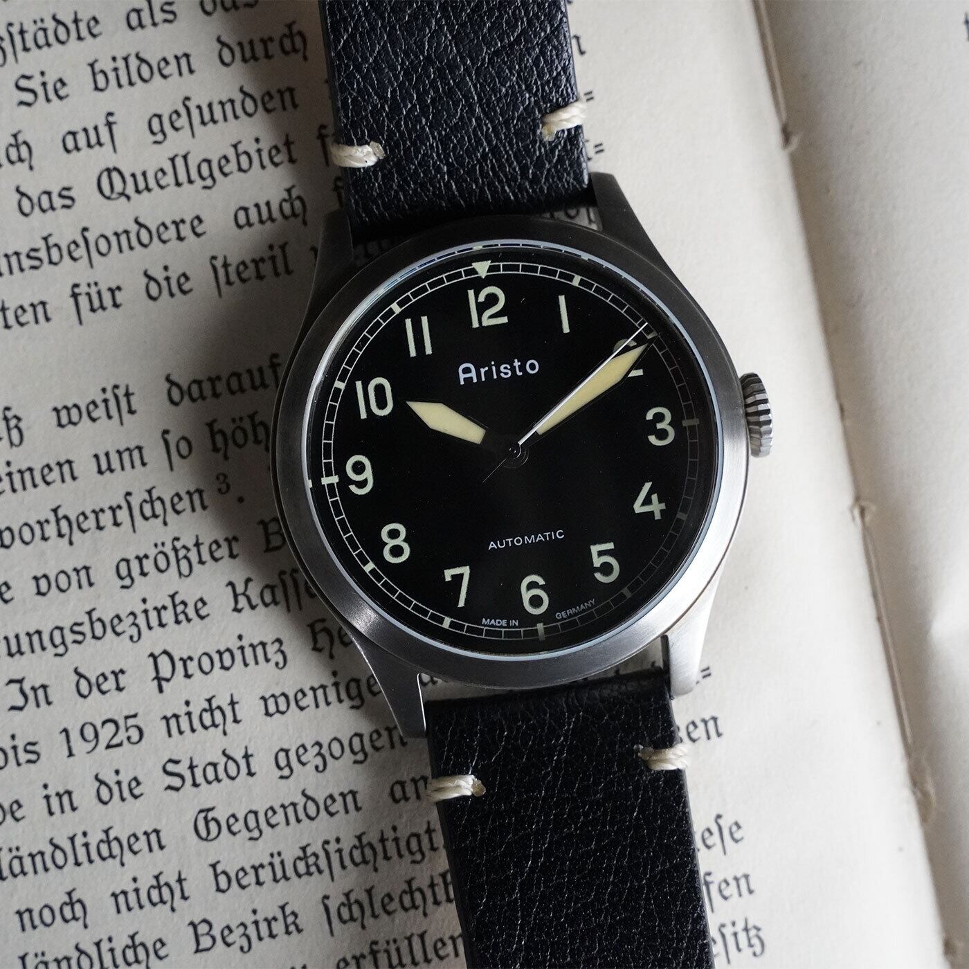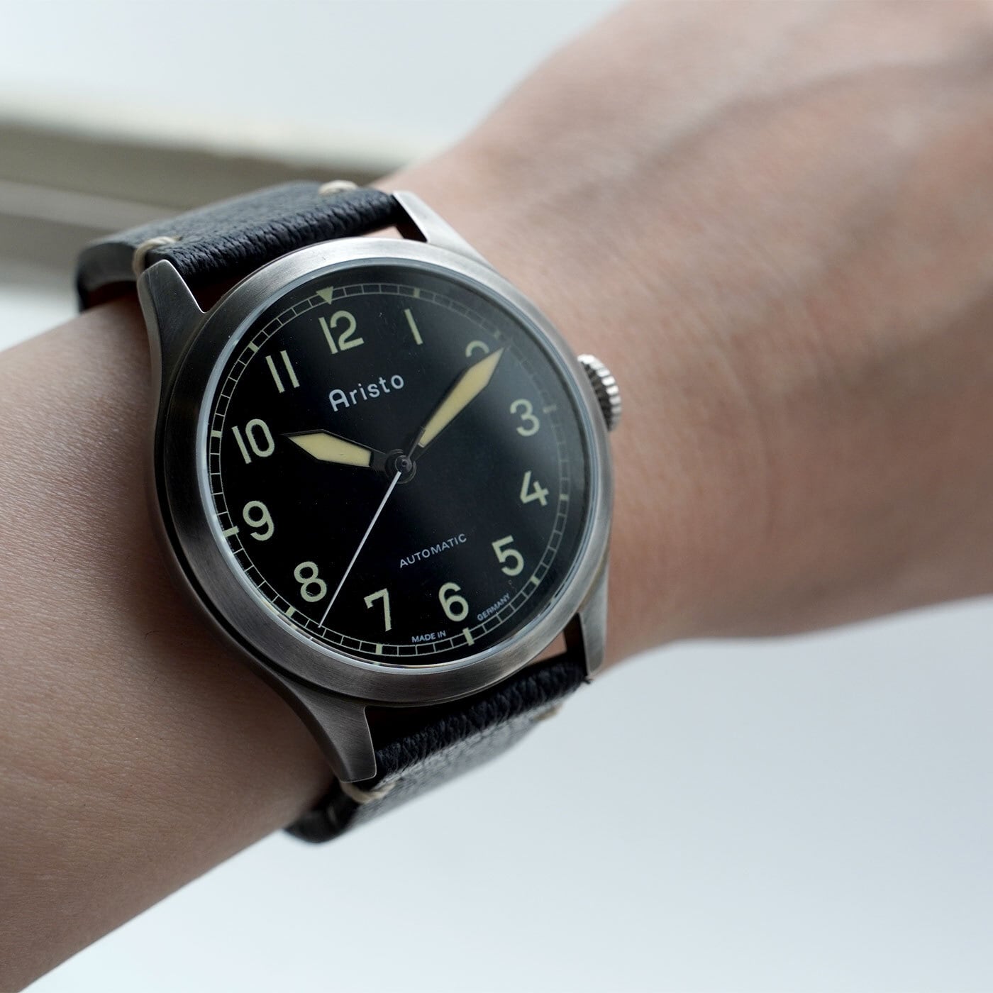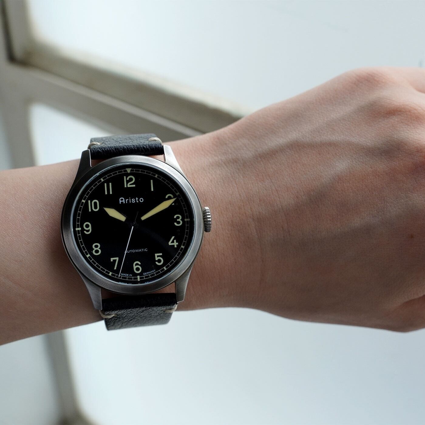 黒い文字盤に、夜光の載ったアラビアインデックスは